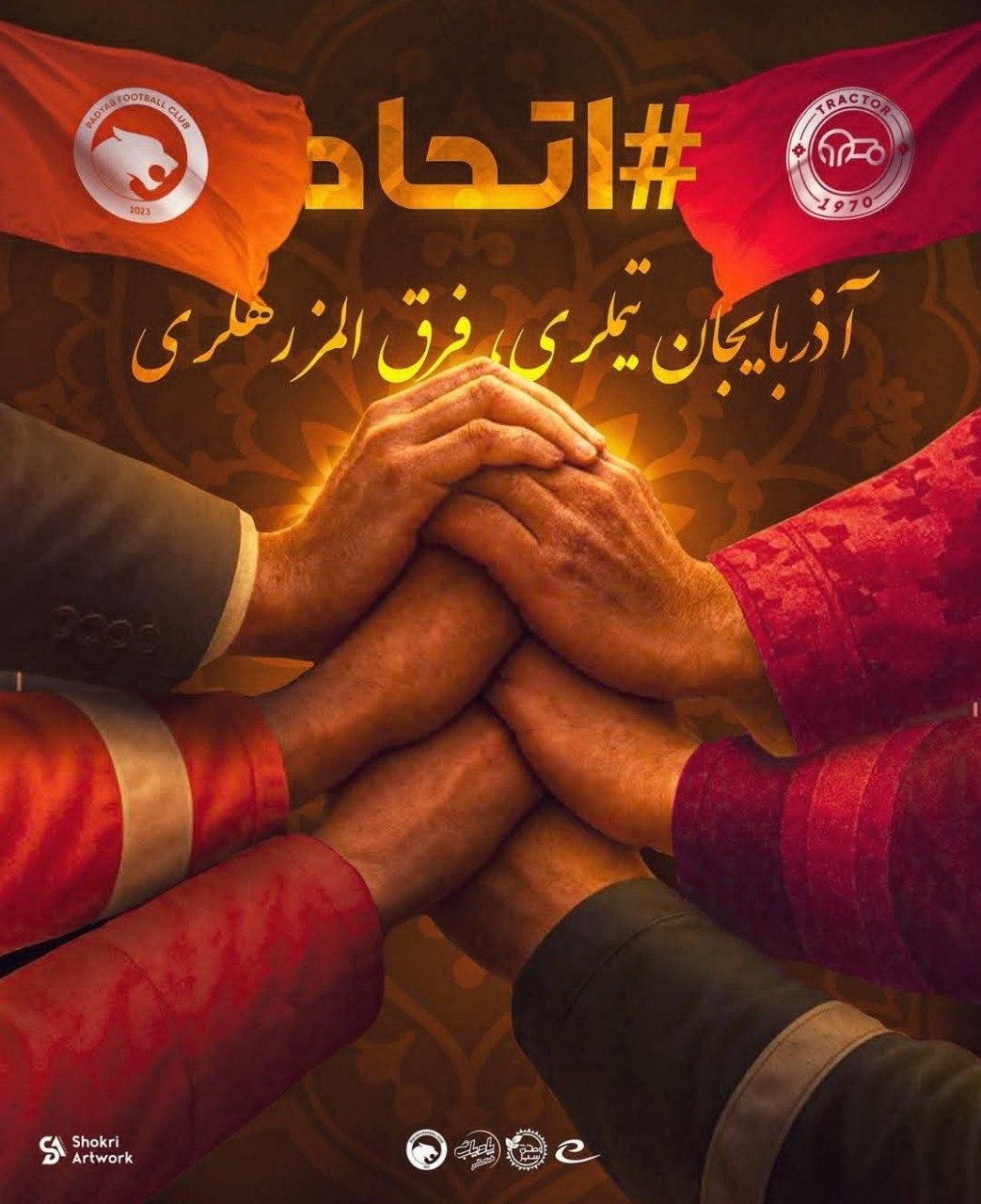 در این تصویر، پرچم پادیاب خلخال در کنار پرچم تراکتور تبریز دیده میشود و چندین دست با پیراهنهای مختلف (که احتمالاً نمادی از تیمهای آذربایجانی است) روی هم قرار گرفتهاند تا بر پیوند و حمایت متقابل تأکید کنند.