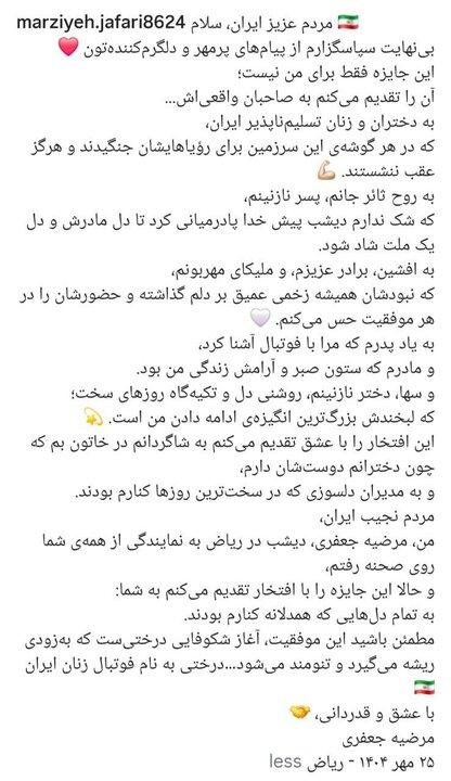 سپاسگزارم از پیامهای پرمهر و دلگرم کننده تون این جایزه فقط برای من نیست؛ آن را تقدیم میکنم به صاحبان واقعیاش… به دختران و زنان تسلیمناپذیر ایران، که در هر گوشهی این سرزمین برای رؤیاهایشان جنگیدند و هرگز عقب ننشستند. به روح ثائر جانم، پسر نازنینم، که شک ندارم دیشب پیش خدا پادرمیانی کرد تا دل مادرش و دل یک ملت شاد شود. به افشین، برادر عزیزم، و ملیکای مهربونم که نبودشان همیشه زخمی عمیق بر دلم گذاشته و حضورشان را در هر موفقیت حس میکنم. به یاد پدرم که مرا با فوتبال آشنا کرد و مادرم که ستون صبر و آرامش زندگی من بود. و سها، دختر نازنینم، روشنی دل و تکیهگاه روزهای سخت؛ که لبخندش بزرگترین انگیزهی ادامه دادن من است. این افتخار را با عشق تقدیم میکنم به شاگردانم در خاتون بم که چون دخترانم دوستشان دارم، و به مدیران دلسوزی که در سختترین روزها کنارم بودند. مردم نجیب ایران من، مرضیه جعفری در ریاض به نمایندگی از همهی شما روی صحنه رفتم و حالا این جایزه را با افتخار تقدیم میکنم به شما: به تمام دلهایی که همدلانه کنارم بودند. مطمئن باشید این موفقیت، آغاز شکوفایی درختیست که بهزودی ریشه میگیرد و تنومند میشود…درختی به نام فوتبال زنان ایران با عشق و قدردانی