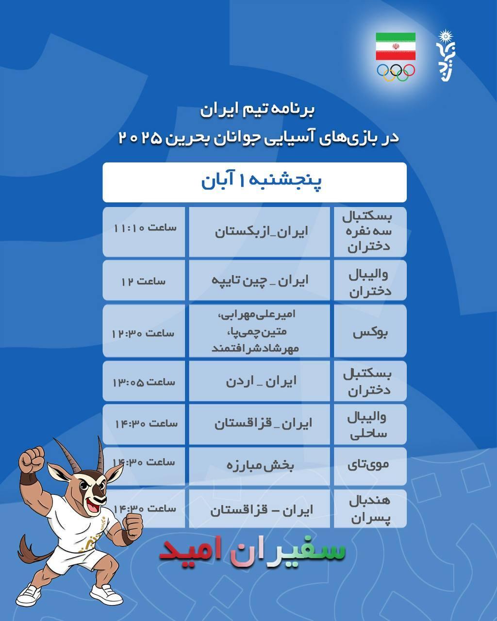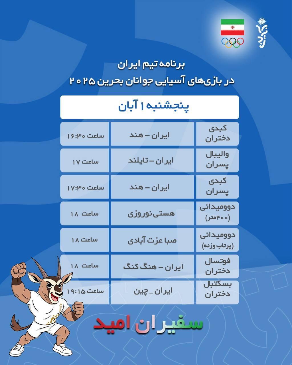 خبرگزاری تماشاگر - ورزشکاران کشورمان در بازیهای آسیایی جوانان امروز یکم آبان در چندین رشته به مصاف حریفان خود میروند.