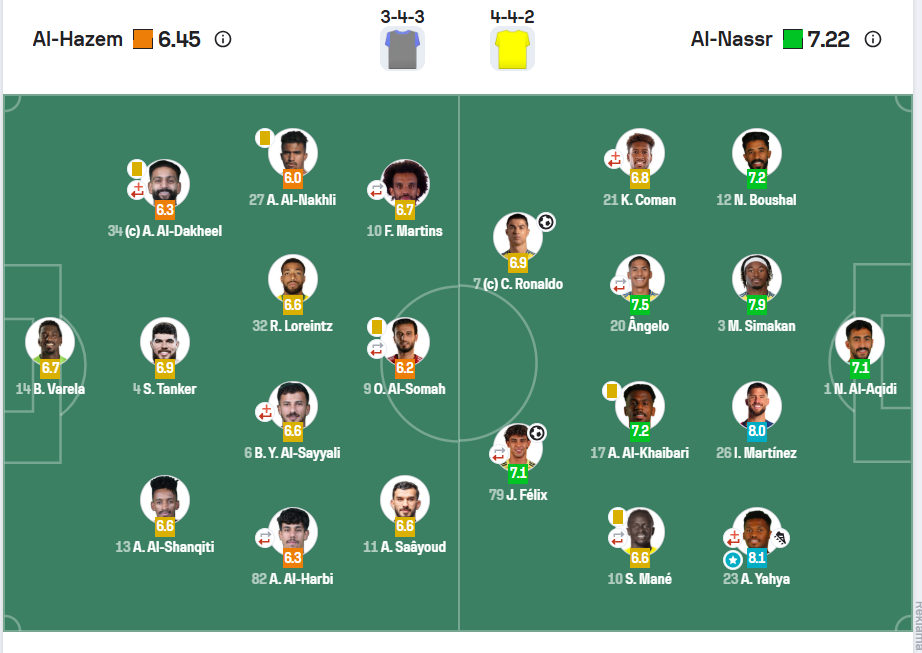 ژائو فلیکس که پیش از این بازی با 8 گل زده در صدر جدول گلزنان قرار داشت، در این بازی هم سنت شکنی نکرد و پایش در دقیقه 25 به گل باز شد، گل دیگر النصر را هم کریستیانو رونالدو در دقیقه 88 به ثمر رساند تا زردپوشان ریاض با کسب 18 امتیاز از 6 بازی، صدرنشین لیگ عربستان باشند.