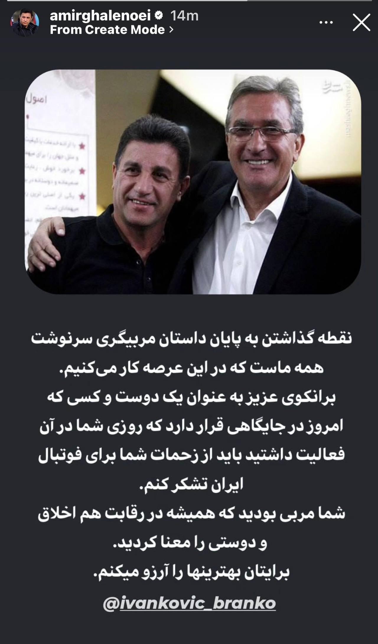 باشگاه خبرنگاران جوان - امیر قلعه نویی سرمربی تیم ملی فوتبال ایران پیامی را در صفحه شخصی اش به مناسبت خداحافظی برانکو ایوانکوویچ سرمربی سابق تیم ملی و باشگاه پرسپولیس از دنیای مربیگری منتشر کرد.