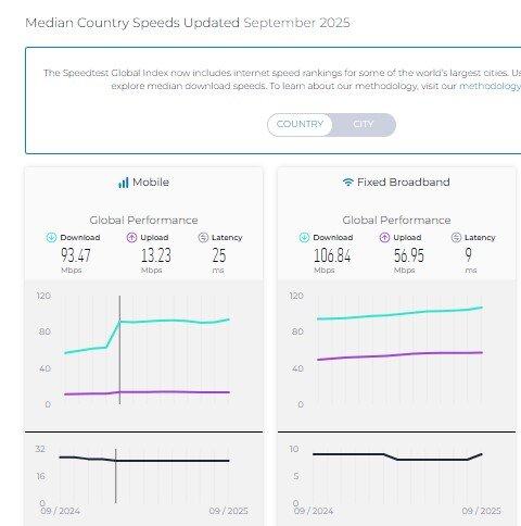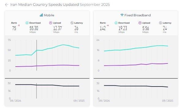 خبرگزاری تماشاگر - جایگاه ایران در رده بندی کشورهایی با بیشترین میانه سرعت اینترنت موبایل و ثابت در سپتامبر ۲۰۲۵ میلادی با سقوط روبرو شده است.