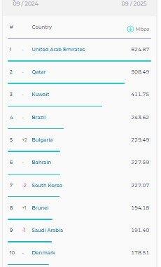 به گزارش خبرنگار مهر، جدیدترین گزارش اسپید تست نشان میدهد در سپتامبر ۲۰۲۵ میلادی در سطح جهانی میانه سرعت اینترنت موبایل ۹۳.۴۷ و سرعت اینترنت ثابت ۱۰۶.۸۴ مگابیت برثانیه بوده است. این درحالی است که در آگوست، یعنی ماه قبل از آن میانه سرعت اینترنت موبایل جهان ۹۰.۶۹ و میانه سرعت اینترنت ثابت جهان ۱۰۴.۴۳ مگابیت بر ثانیه بوده است. سقوط ۶ پلهای ایران در رده بندی اینترنت موبایل طبق این گزارش میانه سرعت اینترنت موبایل ایران در نهمین ماه ۲۰۲۵ میلادی ۵۵.۳۰ و میانه سرعت اینترنت ثابت ۱۹.۲۳ مگابیت بر ثانیه بوده است. این در حالی است که جایگاه ایران در هر دو رده بندی دچار افت شده به طوری که در فهرست کشورهایی با بیشترین میانه سرعت اینترنت موبایل شش پله و در رده بندی کشورهایی با بیشترین میانه سرعت اینترنت ثابت چهار پله سقوط کرده است. این در حالی است که میانه سرعت اینترنت موبایل ایران در آگوست سال جاری میلادی ۵۷.۶۴ مگابیت بوده و جایگاه آن در رده بندی کشورهایی با بیشترین میانه سرعت اینترنت موبایل جهان با چهار پله سقوط رده ۶۹ اعلام شده بود. از سوی دیگر در رده بندی کشورهایی با بیشترین میانه سرعت اینترنت ثابت جهان ایران با میانه سرعت ۱۹.۵۱ مگابیت برثانیه در رده ۱۳۹ قرار گرفت که جایگاه آن نسبت به ماه قبل یک پله سقوط کرده است. صعود دو پلهای بلغارستان در فهرست کشورهایی با بیشترین میانه سرعت اینترنت موبایل در رده بندی کشورهایی با بیشترین میانه سرعت اینترنت موبایل، کشورهای حاضر در رده نخست تا چهارم در نهمین ماه ۲۰۲۵ میلادی نسبت به ماه قبل از آن هیچ تغییری نکرده اند. این کشورها به ترتیب امارات متحده عربی (۶۲۴.۸۷ مگابیت برثانیه)، قطر (۵۰۸.۴۹ مگابیت برثانیه)، کویت (۴۱۱.۷۵ مگابیت برثانیه)، برزیل (۲۴۳.۶۲ مگابیت برثانیه) هستند. در رده پنجم و ششم به ترتیب بلغارستان با میانه سرعت ۲۲۹.۴۹ و بحرین با میانه سرعت ۲۲۷.۵۹ مگابیت برثانیه قرار دارند. هرچند جایگاه بلغارستان در این رده بندی نسبت به اکتبر ۲۰۲۵ میلادی دوپله صعود کرده اما جایگاه بحرین هیچ تغییری نسبت به ماه قبل نکرده است. کره جنوبی که در این فهرست دو پله سقوط کرده با میانه سرعت ۲۲۷.۰۷ مگابیت برثانیه در رده هفتم قرار دارد. برونئی با میانه سرعت ۱۹۴.۱۸ مگابیت برثانیه در رده هشتم قرار دارد که جایگاه آن نسبت به ماه اکتبر یک پله صعود کرده است. در ردههای نهم و دهم به ترتیب عربستان سعودی (۱۹۱.۴۰ مگابیت برثانیه) و دانمارک (۱۷۸.۵۱ مگابیت برثانیه) قرار دارند. جایگاه عربستان در این رده بندی نسبت به ماه گذشته یک پله سقوط کرده اما وضعیت دانمارک نسبت به ماه قبل هیچ تغییری نداشته است. سنگاپور و شیلی پر سرعت ترین های رده بندی اینترنت ثابت در رده بندی کشورهایی با بیشترین میانه سرعت اینترنت موبایل نیز تغییر چندانی نسبت به ماه گذشته رخ نداده و کشورهای حاضر در ردههای یکم تا هفتم مانند هشتمین ماه میلادی در این فهرست قرار گرفته اند که به ترتیب عبارتند از سنگاپور (۴۰۰.۶۸ مگابیت برثانیه)، شیلی (۳۲۵.۶۳ مگابیت برثانیه)، هنگ کنگ (۳۳۸.۸۱ مگابیت برثانیه)، امارات متحده عربی (۳۳۴.۱۳ مگابیت برثانیه)، فرانسه (۳۱۶.۰۲ مگابیت برثانیه)، ماکائ و(۳۱۳.۶۶ مگابیت برثانیه) و آمریکا (۲۸۹.۴۴ مگابیت برثانیه). در رده هشتم این فهرست ایسلند با میانه سرعت ۲۷۱.۹۹ مگابیت برثانیه قرار دارد که جایگاه آن نسبت به ماه گذشته ۲ پله صعود کرده است. در ده نهم فهرست نیز با دو پله صعود رژیم صهیونیستی قرار دارد که میانه سرعت آن ۲۶۴.۵۵ مگابیت برثانیه ثبت شده است. اما در رده دهم فهرست تایلند با میانه سرعت ۲۶۴.۵۴ مگابیت برثانیه قرار دارد که جایگاه آن نسبت به ماه اکتبر یک پله سقوط کرده است.